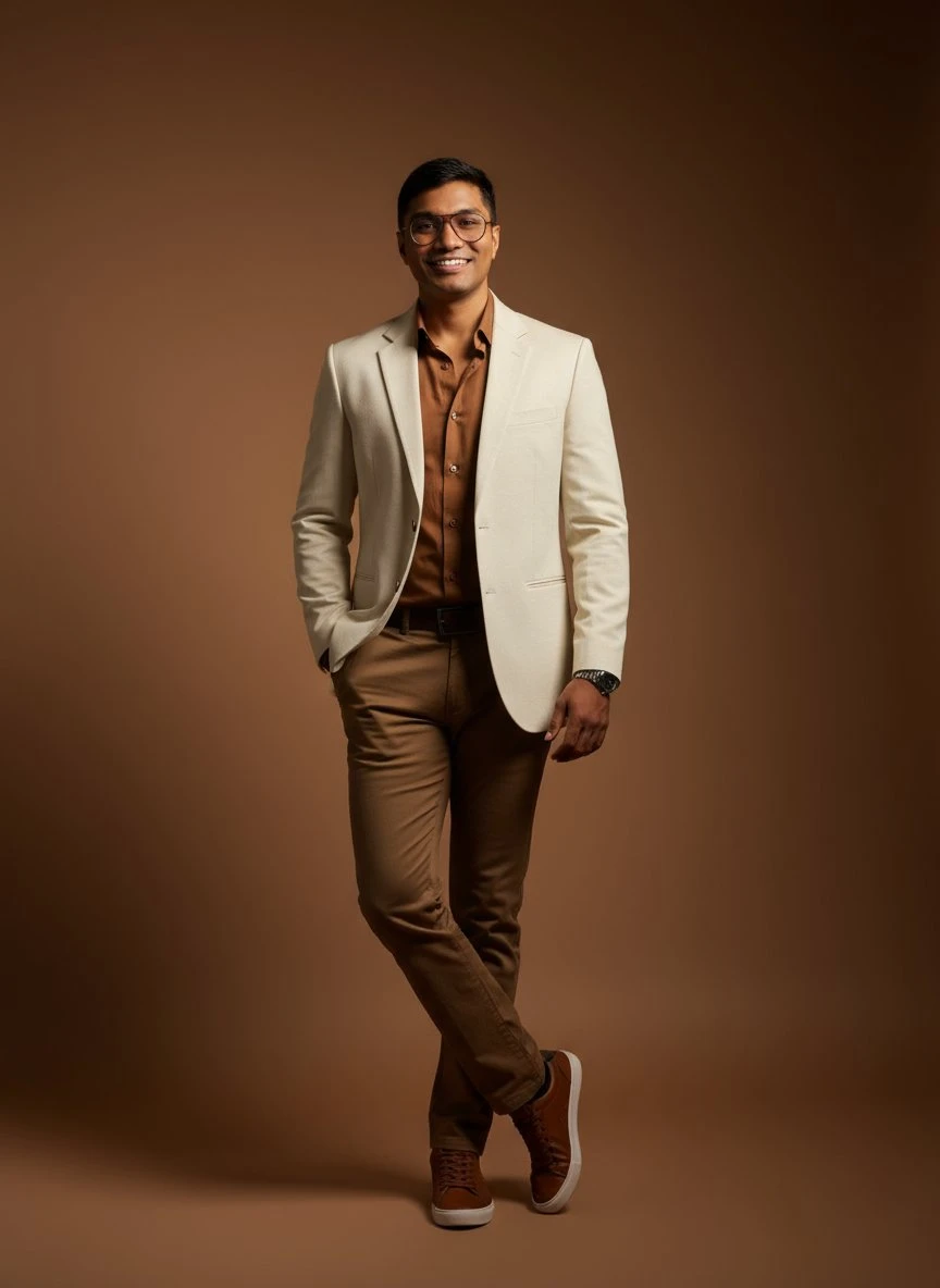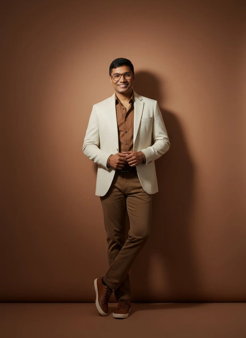 Studio portrait of an athletic man matching the face of the uploaded photo exactly, wearing an off white blazer, slim-fit trousers, brown sneakers, and a brown shirt slightly unbuttoned. He is standing cross-legged with one shoulder slightly touching a wall behind his back. The background is gradient brown with spotlight lighting, in the style of a fashion photoshoot. HD quality, realistic, face not changed.