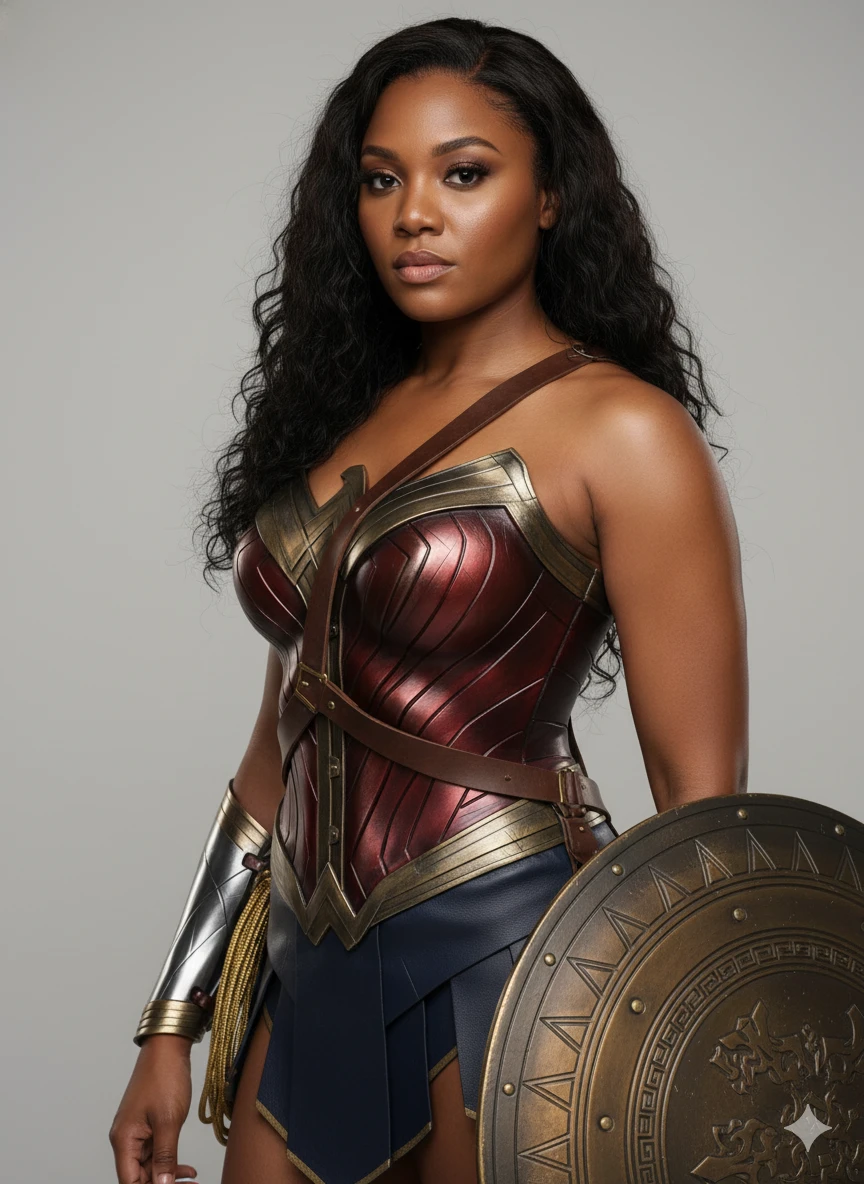 A professional, medium-length studio portrait capturing a female figure as a powerful Amazon warrior. The subject is posed at a three-quarter angle, with a strong, confident posture and a direct, determined gaze toward the camera, conveying courage and strength. She wears iconic battle armor: a tight-fitting corset with a metallic finish in bronze and red tones, with a gold eagle-shaped emblem or 'WW' on the chest. The lower part is a layered battle skirt of dark gray or navy blue leather. Abrown leather harness crosses her chest, and silver-colored metal bracelets (Bracelets of Submission) adorn her wrists. A shiny gold Lasso of Truth is attached to the belt at her hip. The edge of a large, round bronze shield with classical engravings is visible at her side. Her hair is long, dark, and voluminous, with natural waves that fall over her shoulders, framing her face. The background is a solid-color studio backdrop in a light, neutral gray tone, keeping the focus on the character.The lighting is dramatic yet soft, sculpting the facial features and highlighting the metallic and leather textures of the armor, with a key light that creates depth and a fill light that softens the shadows. Camera Settings: Captured with a prime portrait lens (e.g., 85mm) on a full-frame camera for a heroic, distortion-free perspective. Aperture set between f/4.0 and f/5.6 to ensure sharpness across the subject and armor. ISO 100-200 for maximum studio image quality. Shutter speed 1/160s to1/250s. Studio lighting with a large softbox or octabox as the main light to create soft, directional light, and a reflector to fill in the shadows. Instructions for the "nano banana": "Please use the user's reference image to capture and apply all of their facial features, facial structure, eye color, skin tone, hair style, and color with maximum fidelity. The goal is to create a version of the user as this Amazon warrior. The armor, accessories, pose, dramatic lighting, and studiobackground should be generated as described, creating a perfect fusion between the user's identity and the character's aesthetic."
