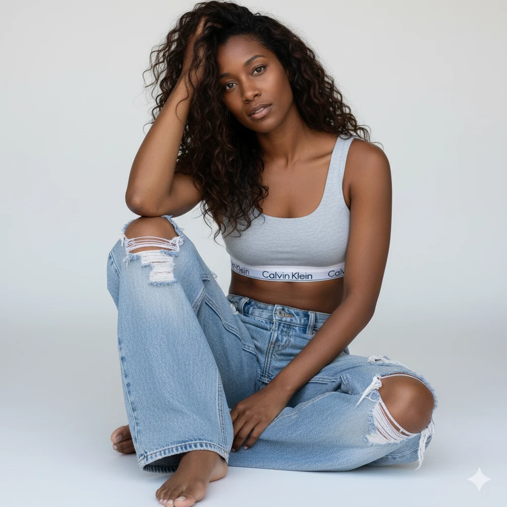 Studio shot. Bold sporty-casual mood. Use the attached face exactly. Light-gray athletic crop top with thick straps and visible “Calvin Klein” band. Extremely baggy, distressed light-wash jeans, heavy rips at knees and thighs. Seated on floor against bright plain background. Legs bent and crossed. Right arm up, hand on head. Direct intense gaze. Long dark-brown loose waves over shoulders.