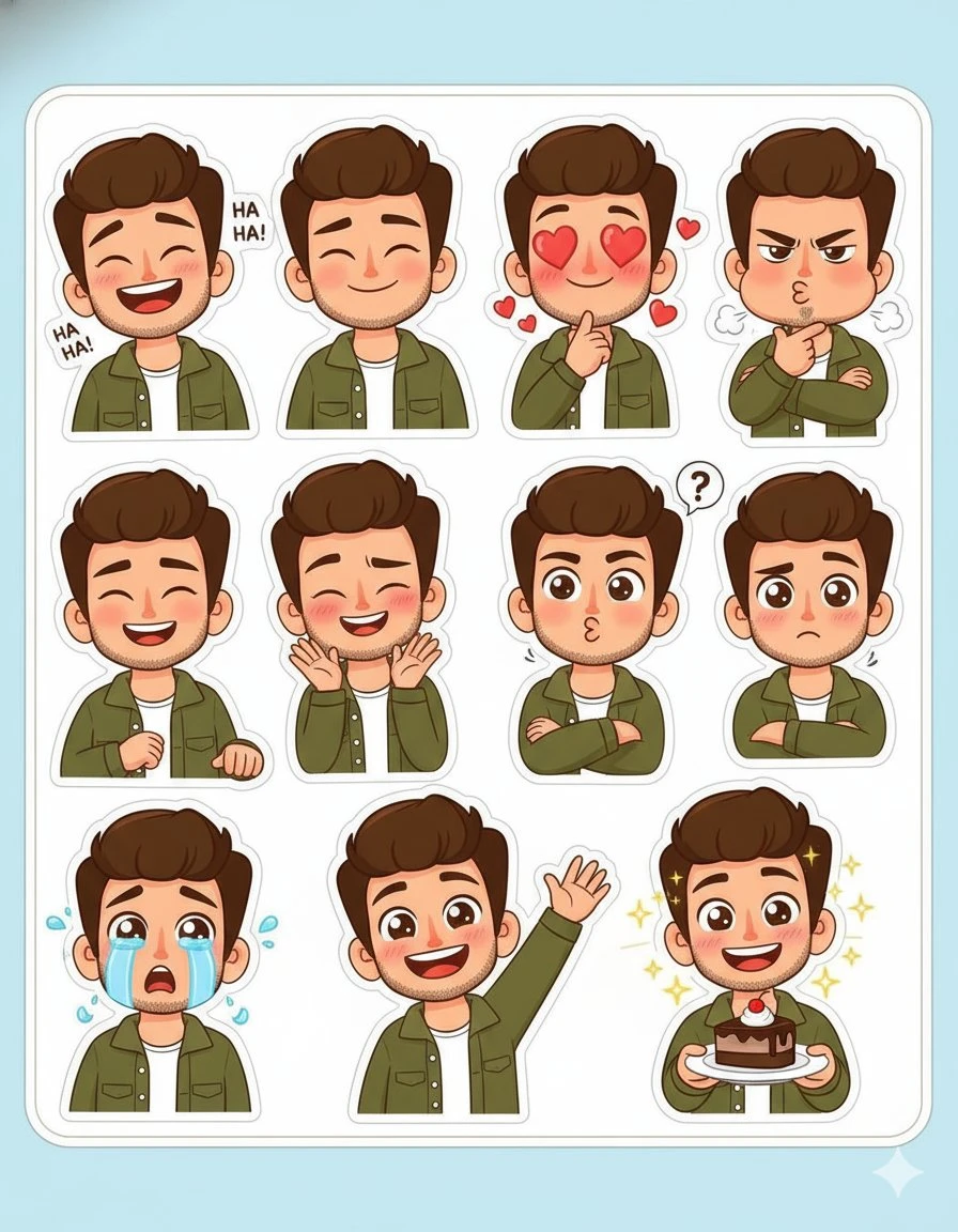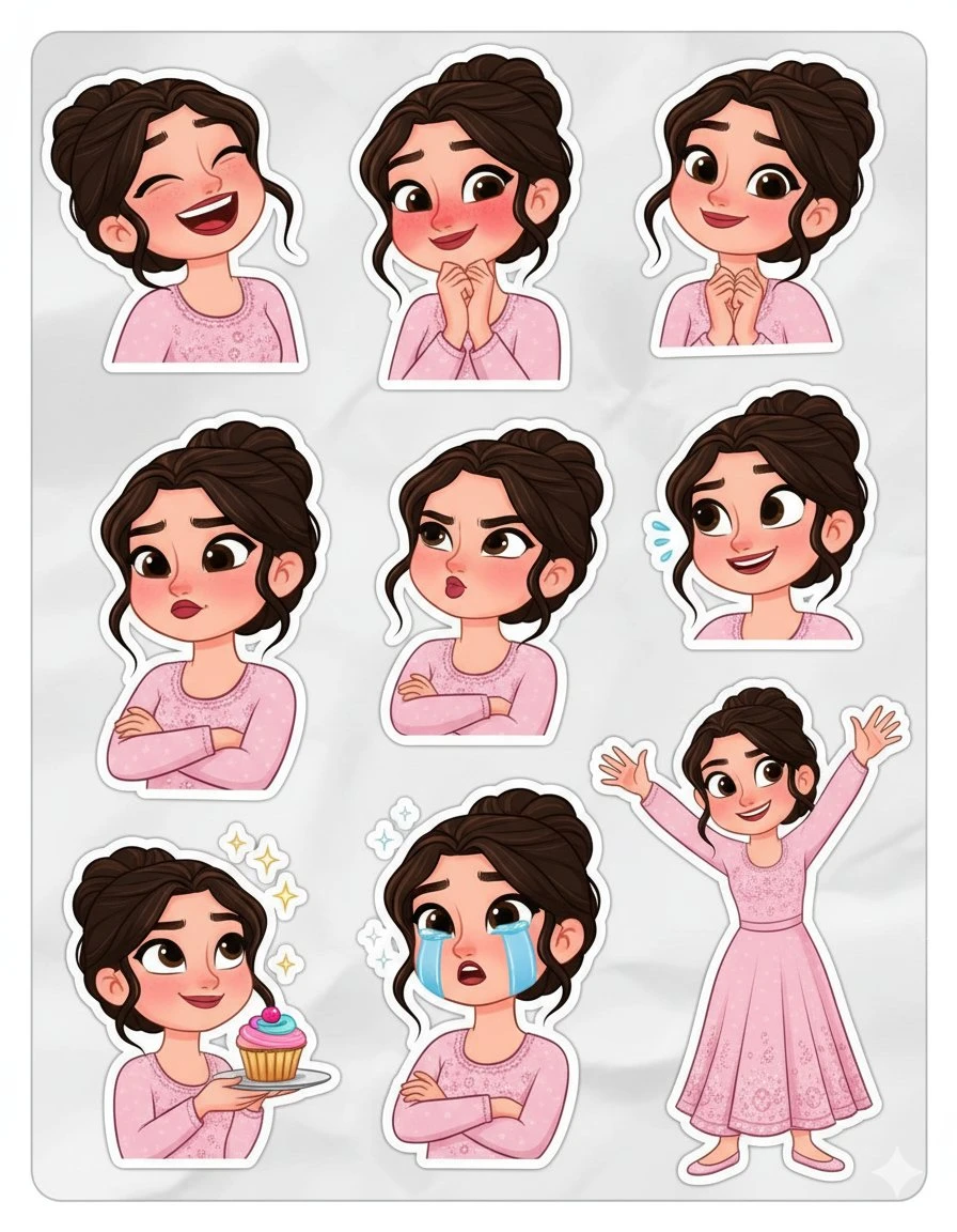 Create a Pixar sticker sheet based on the person in the photo. The stickers should feature various expressive reactions in a cute, cartoon-like style, keeping the hairstyle, facial features, and outfit colors similar to the reference. Each sticker must have a different mood or gesture: Laughing Smiling sweetly Blushing with heart eyes (love) Angry pout Hand on chin (thinking) Crying with big teary eyes Shocked or surprised Waving hello Sparkling with joy Holding a dessert plate (special version)